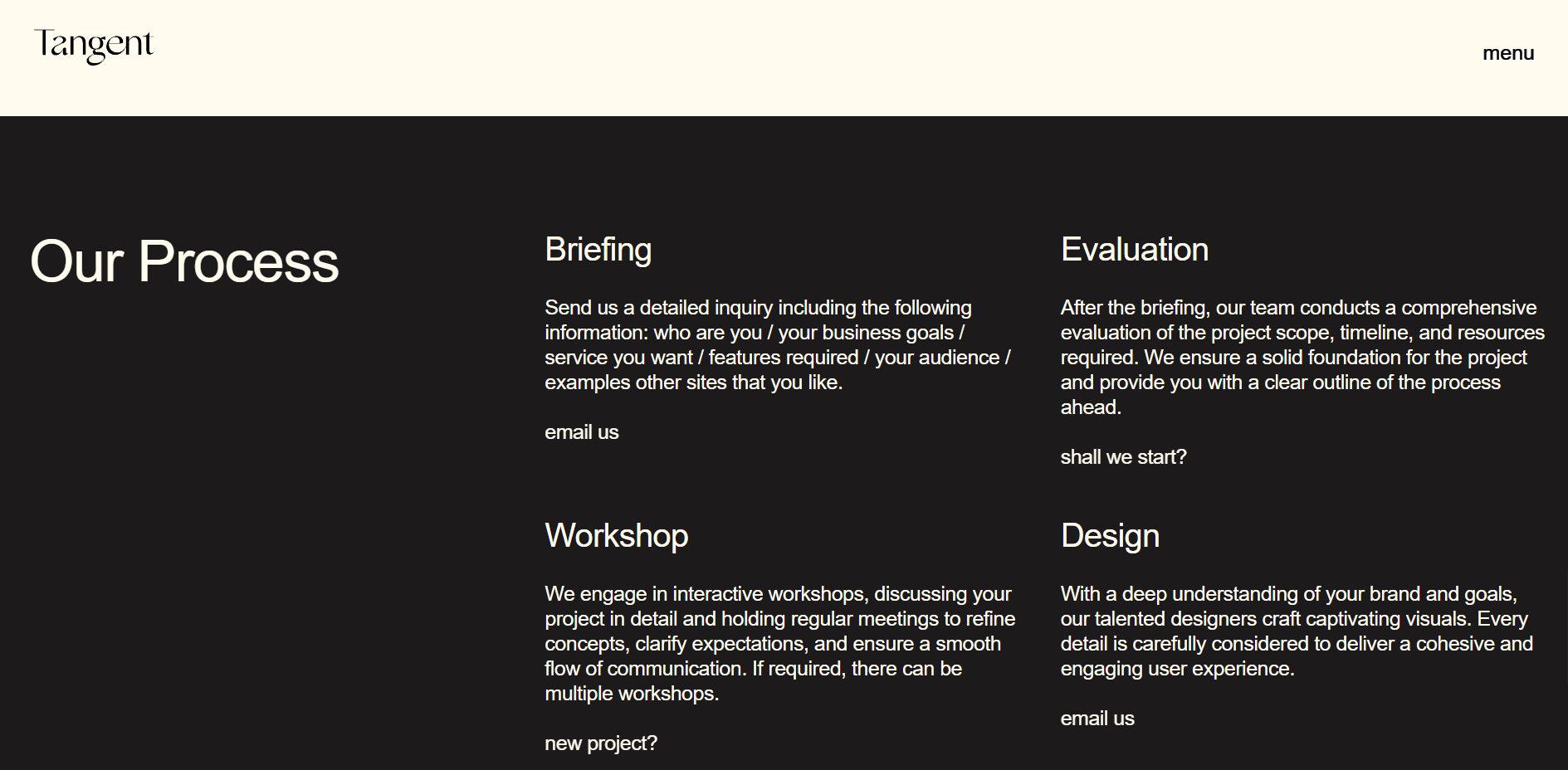 By implementing the new brand identity and website copy, Tangent Studio achieved significant results in a relatively short period. They successfully reached a wider audience, including big brands, startups, and individuals, positioning themselves as a versatile and approachable digital agency. Tangent Studio's increased brand recognition and credibility led to a surge in inbound inquiries and client acquisitions from various sectors.
